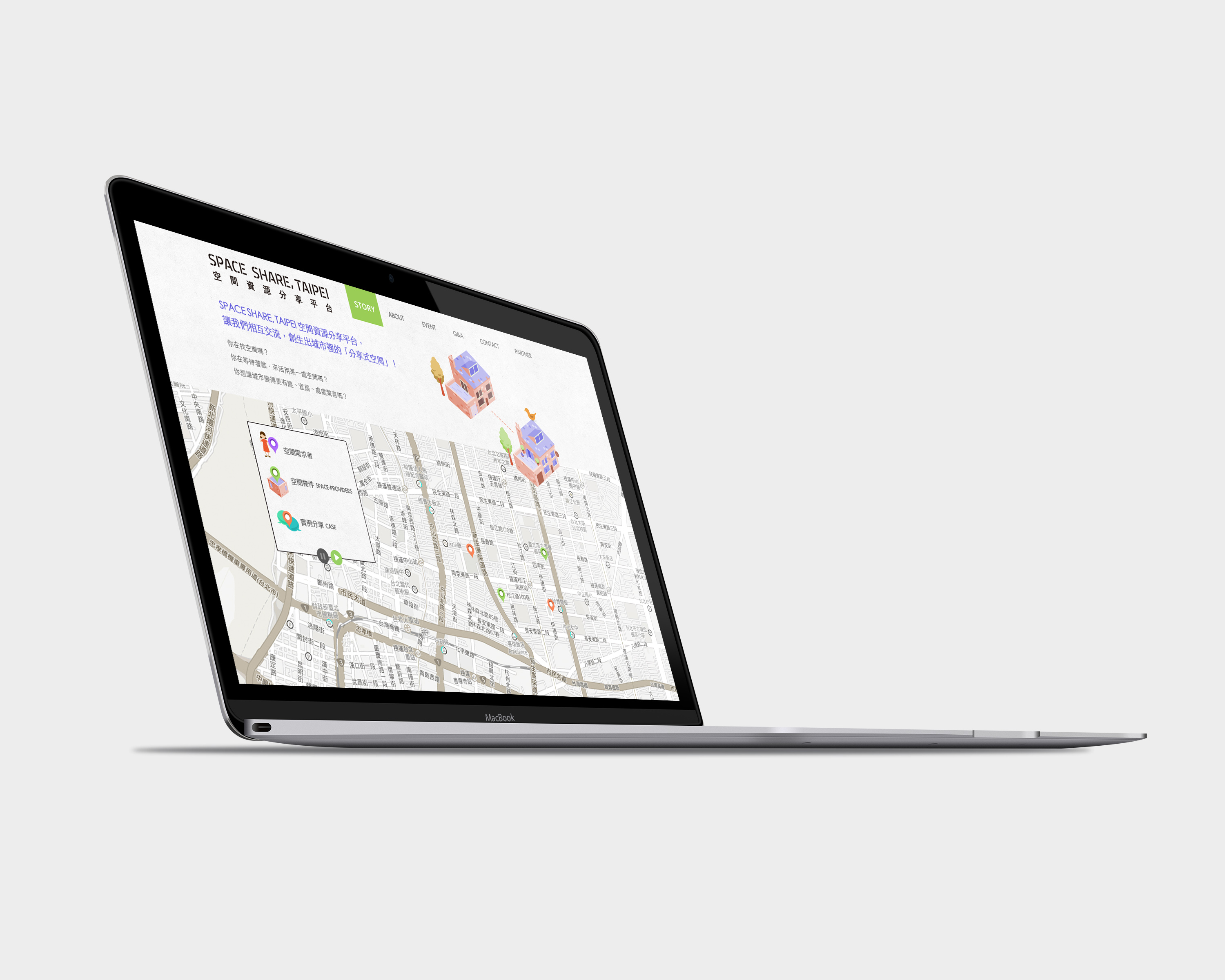 台北市人口稠密,空間有限,台北市都市更新處透過建置空間資源分享平台,以Space share為出發點,媒合空間提供者與需求者,讓原先閒置未用的場域,成為城市對話、夢想萌芽的地方。我們規劃好看易用的後台上稿模式,也增加用戶投稿的便利性,以地圖呈現分別陳列空間提供者、需求者及實例分享,展現空間開源的理念;城市中的故事,由此開始寫下第一個篇章。